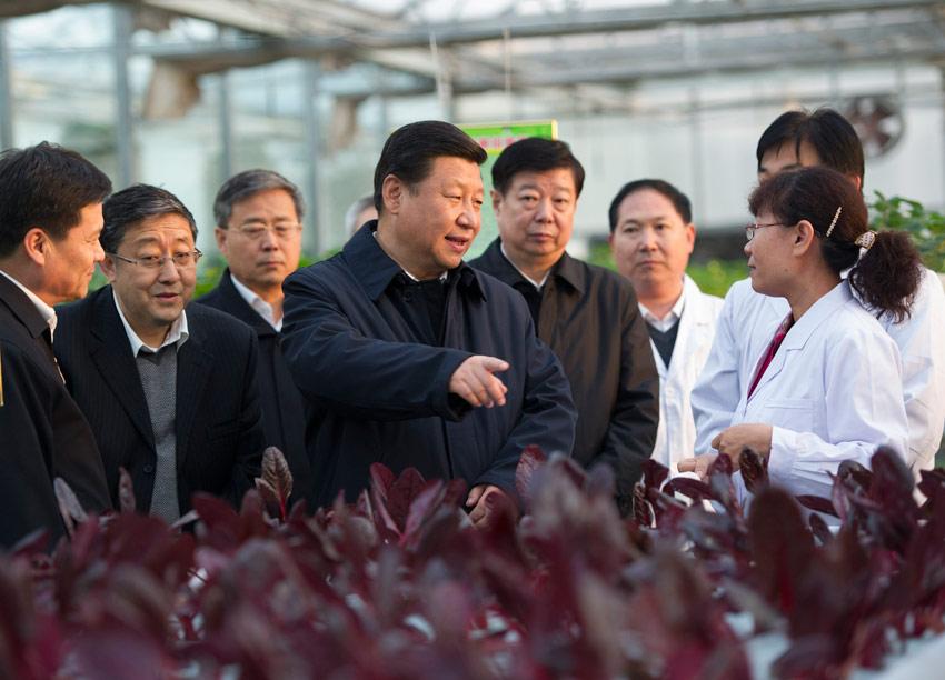 2013年11月27日下午,中共中央总书记、国家主席、中央军委主席习近平在山东省农业科学院智能化温室了解农业科技创新情况。新华社记者 谢环驰 摄
