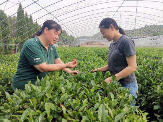 田丽丽博士(左)在烟台招远市的茶园查看茶叶生长。山东省农科院供图