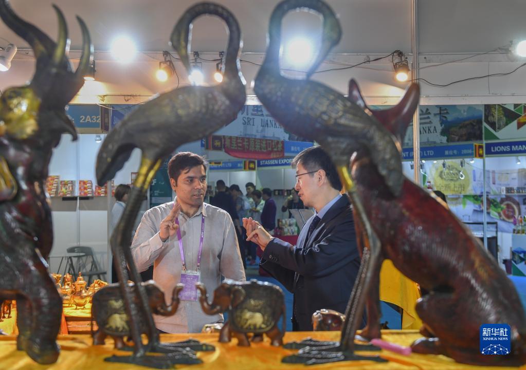 2019年4月18日,在福建泉州石狮市举行的第五届中国(泉州)海上丝绸之路国际品牌博览会上,印度客商(左)向顾客推销印度工艺品。 新华社记者 宋为伟 摄