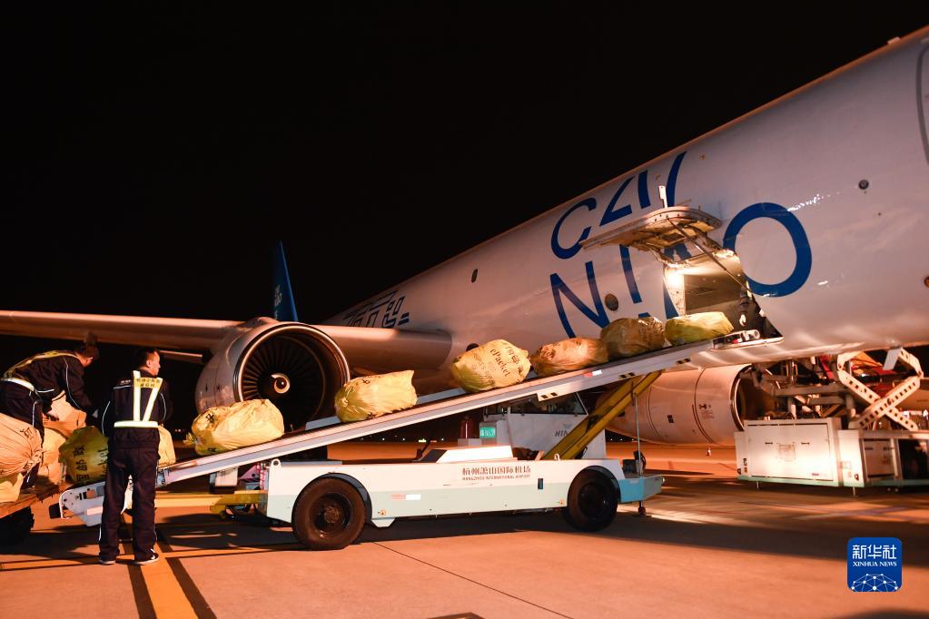 2019年10月30日凌晨,浙江杭州飞往俄罗斯首都莫斯科的首条直达电商货运航线“菜鸟号”从萧山国际机场首航。 新华社记者 黄宗治 摄