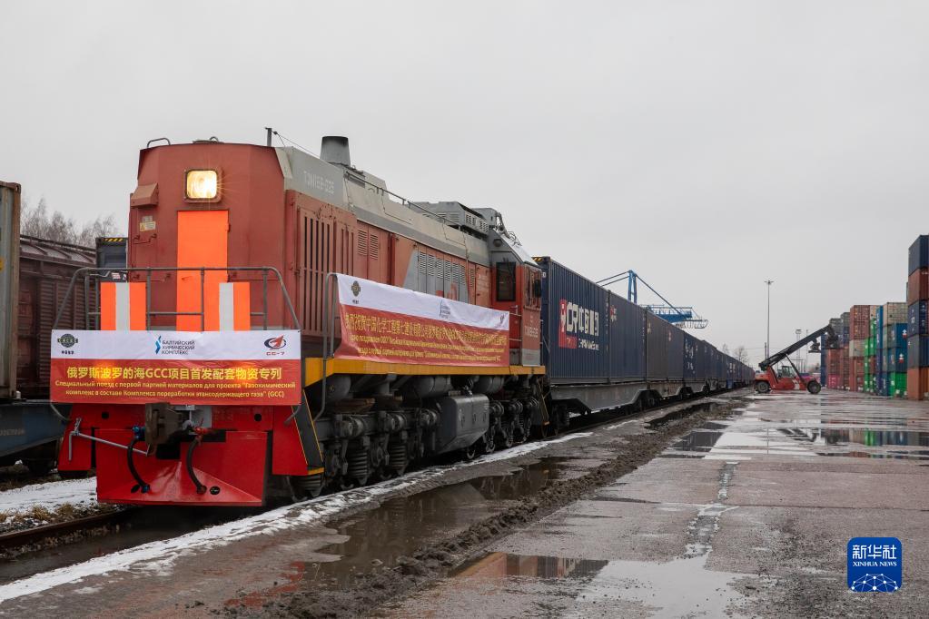 2021年3月15日,由中国成都首发至俄罗斯圣彼得堡市的中欧班列抵达俄罗斯圣彼得堡舒沙雷火车站。 新华社发(俄罗斯铁路公司十月铁路局供图)