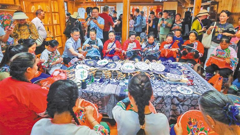 在十八洞村苗绣乡村振兴示范基地,游客观看并体验苗绣制作。宋显金摄(中经视觉)