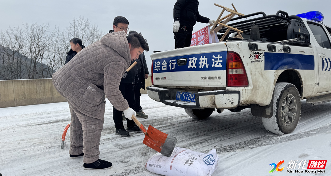 当天,白溪镇主要负责人带领镇领导班子成员及综合行政执法队员、机关干部到资江大桥清冰除雪保畅,工作人员手持工具破冰除雪,同时沿车辙印精准撒布精制工业盐,快速消融冰层、消除打滑隐患。