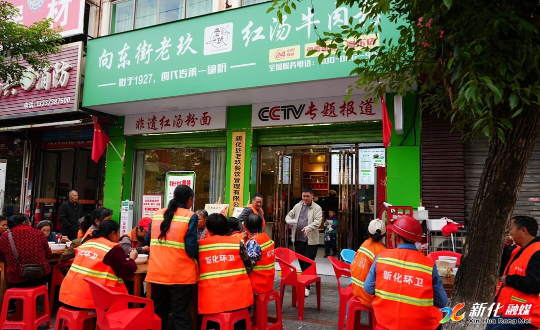 新化新闻网讯(记者 谢婷)10月26日是环卫工人节,当天新化向东街老玖红汤牛肉粉馆邀请40余名环卫工人免费吃红汤牛肉粉,传递社会对城市美容师的尊重与关爱。